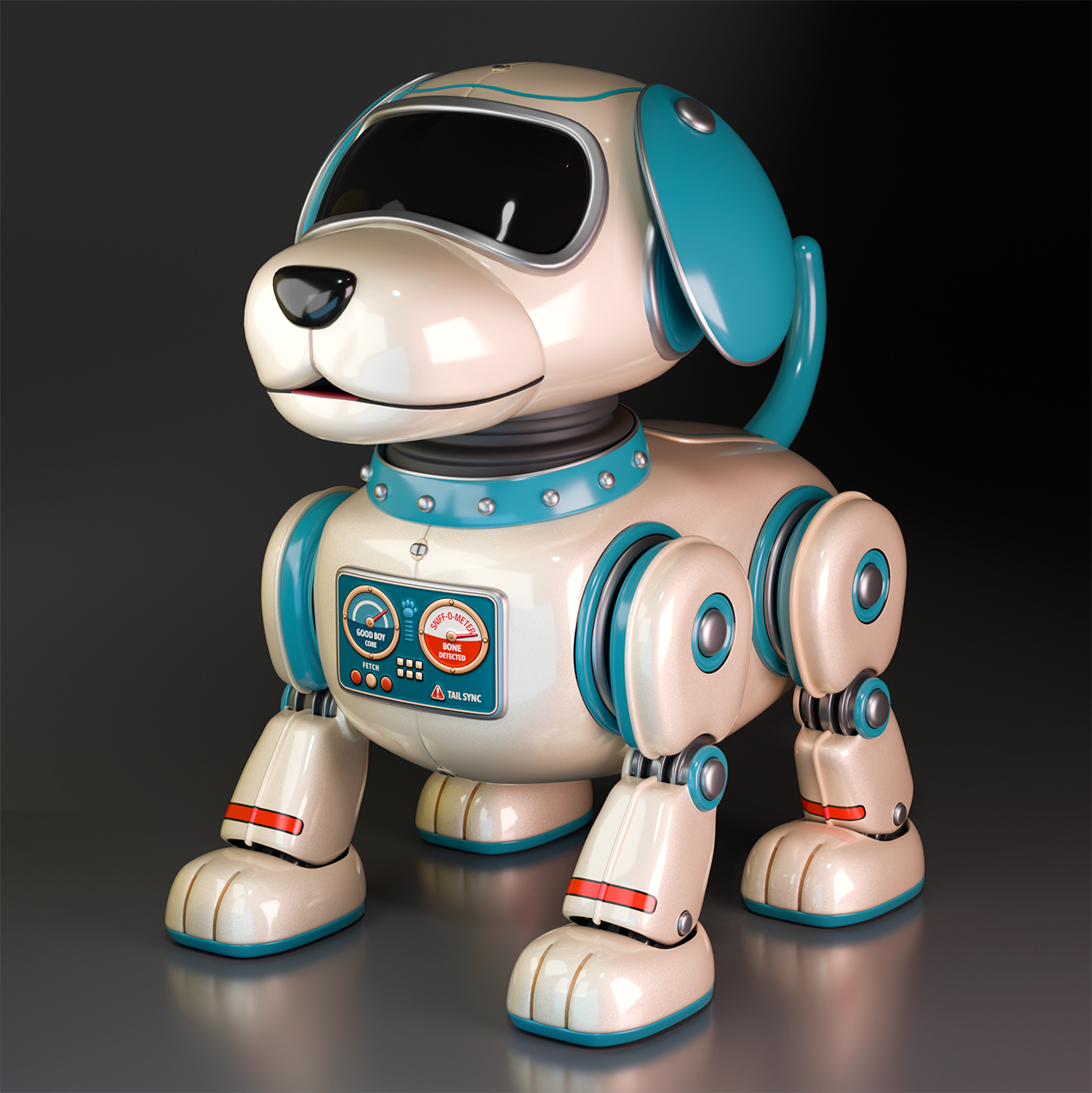 Design-wise, I prefer Sony’s later generation Aibos like the ERS-7 and ERS-1000, which had more rounded features and perhaps appear less “robotic” (I know, ironic), so I based the body style more on those. I also felt it was important to convey a degree of believability to the construction, like obviously visible mechanical joints in the legs, since Aibos are known for their sophisticated movement. At the same time, I didn’t want to stray too far from the mid-century vibe I’m trying to capture in these new designs, so I doubled down on features like old-scool lithography, tin embossing (in the form of bump mapping), clasp joined seams and retro colorways.